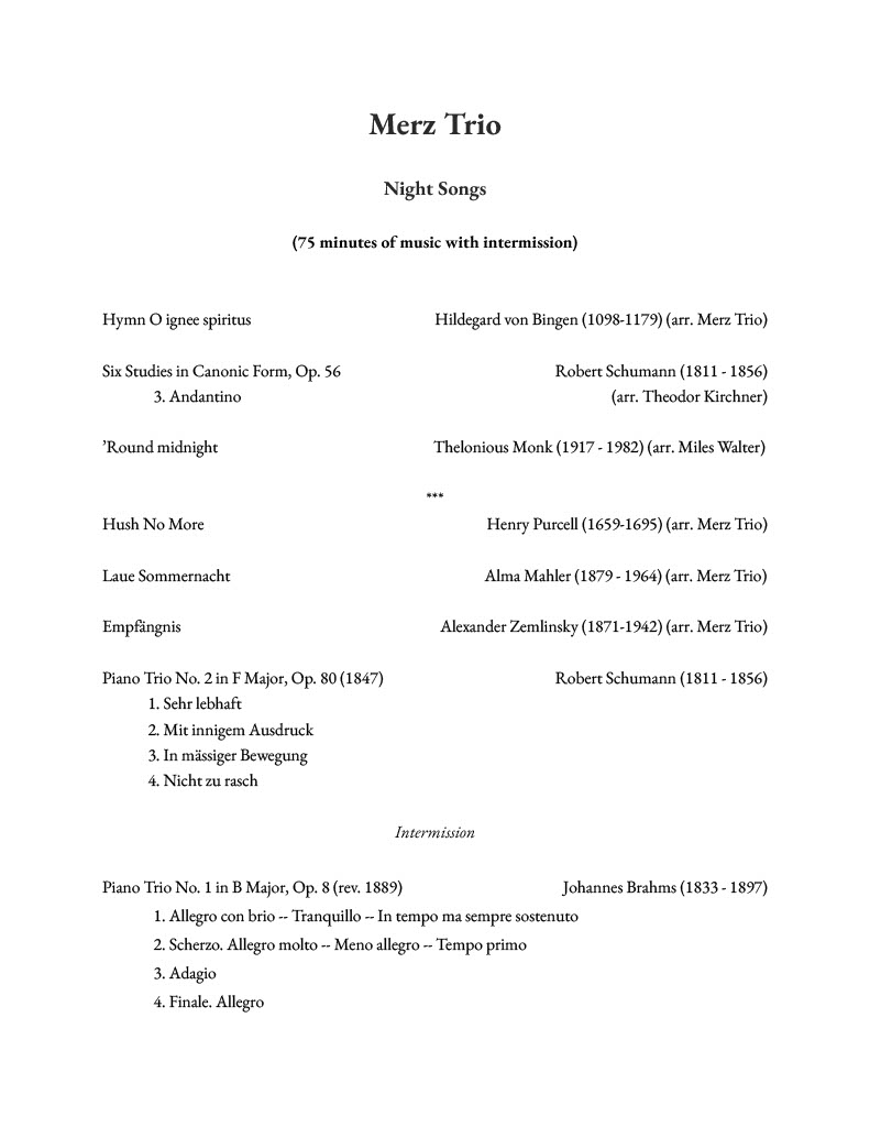 Join Merz Trio as we search for song in night’s darknesses. Beginning with the 12th century chants spun by Hildegard von Bingen in her solitary monastic cell, we explore melody sung into and for the night, weaving together a musical conversation that joins the voices of Purcell, Schumann, Alma Mahler, Brahms and Zemlinsky in works large and small, and brings us right into the twentieth century with Thelonious Monk’s poignantly lonely ode to a dark hour, ‘Round Midnight.
